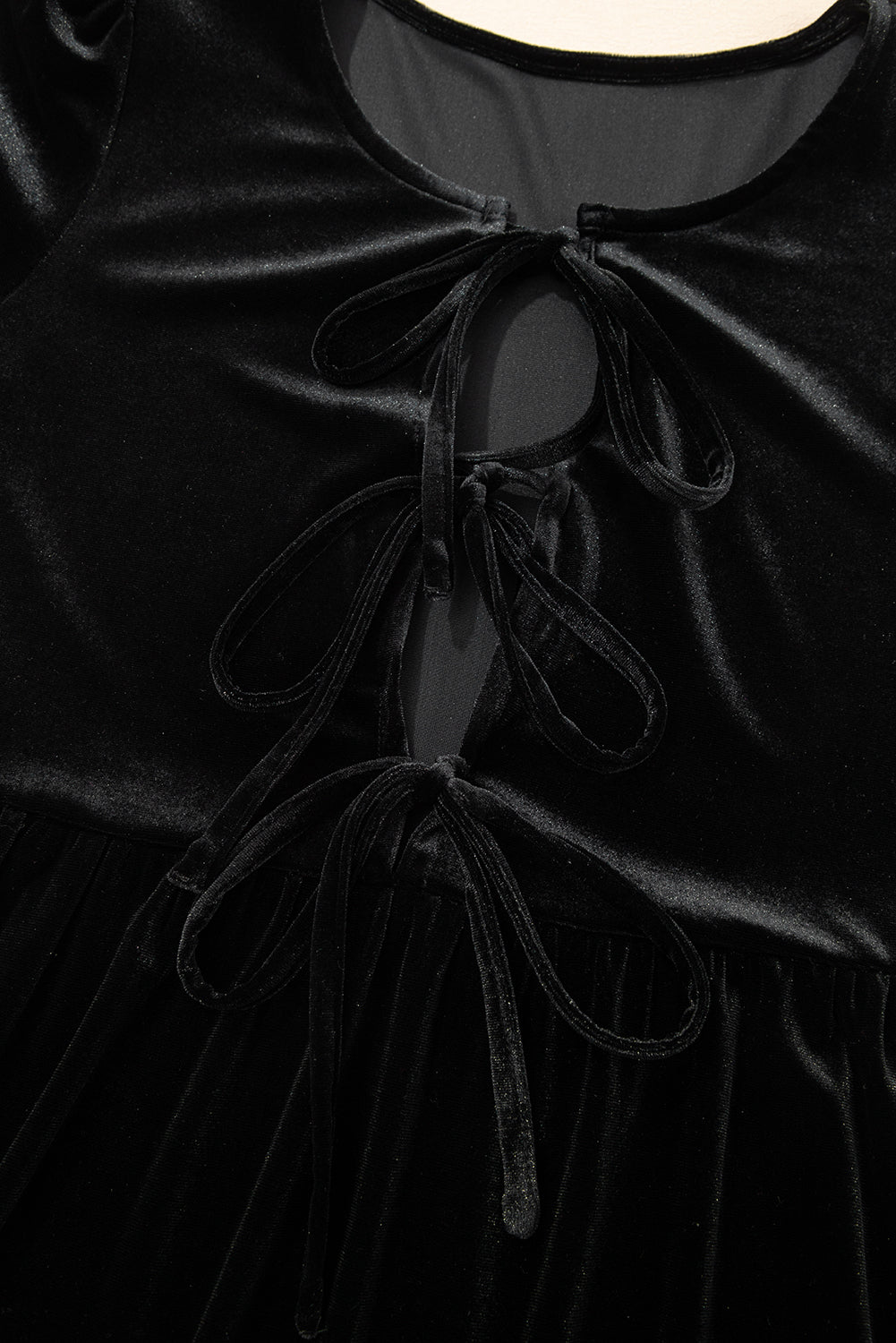 This mini dress is crafted from sumptuous velvet, offering a glossy, figure-flattering shape. Fun bubble sleeves bring a stylish twist, and the front bow tie adds a girlish charm. Great for holiday gatherings and festive nights, its short length beautifully showcases your legs for a flirty vibe.