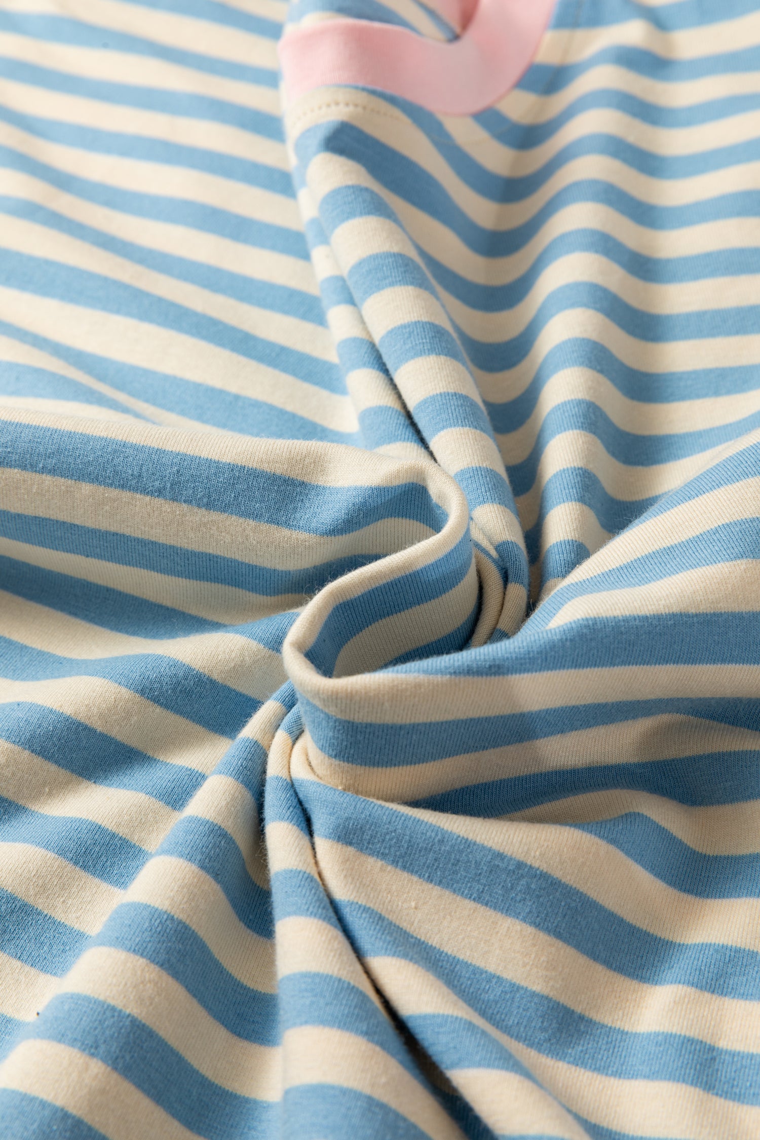 Sky Blue Stripe Contrast Crew Neck Drop Shoulder Loose Tee
